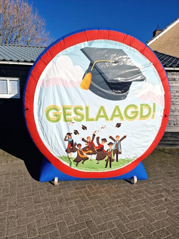 Opblaasbaar verkeersbord met banner geslaagd.